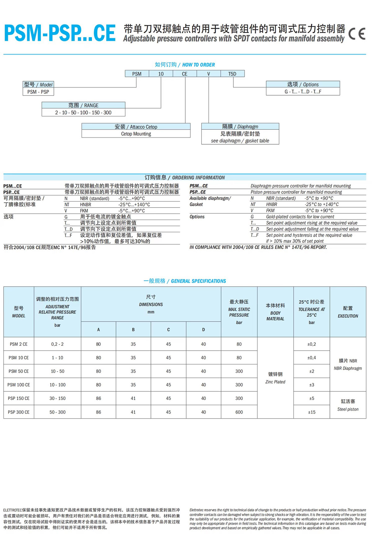 adjustable range from 0.2 to 300 bar, adjustable hysteresis from 10 to 30 % of set-point and C/0 contacts